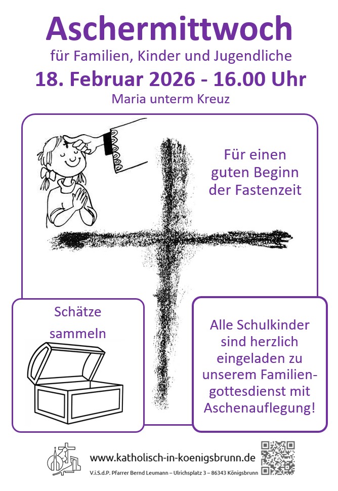 Neben dem Gottesdienst am Mittwochabend um 18:30 Uhr in Zur Göttlichen Vorsehung bieten wir eine Wortgottesfeier für Kinder, Jugendliche und Familien um 16:00 Uhr in Maria unterm Kreuz an – beide Male mit der Möglichkeit, das Aschekreuz zu empfangen.