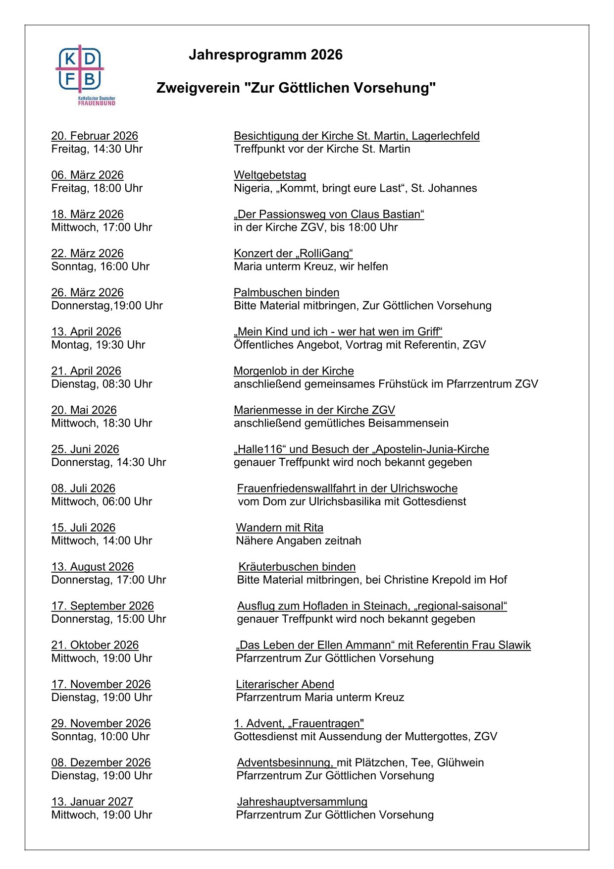 Alle Termine für das Jahr 2026 sehen Sie hier: Sie können das Jahresprogramm auch im PDF-Format herunterladen: Frauenbund Jahresprogramm 2026Herunterladen Kategorien: Frauenbund